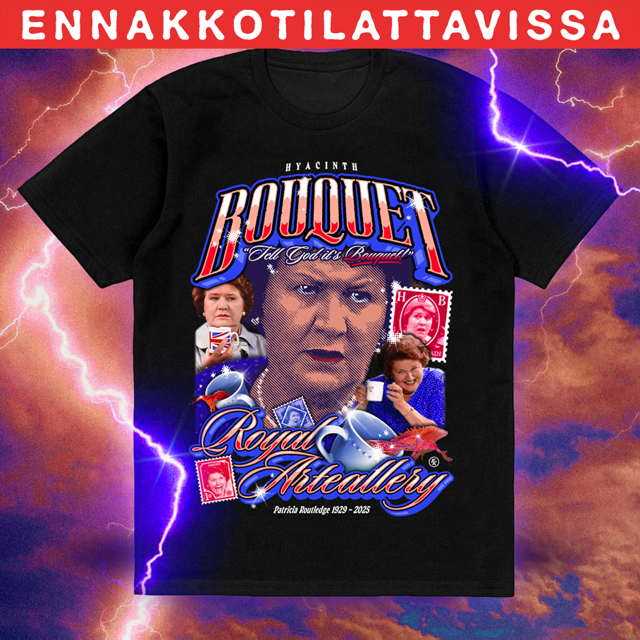 Viime vuonna edesmenneen Patricia Routledgen (1929-2025) muistoksi Bouquet-printtiä on nyt hieman päivitetty vuodelle 2026. Printissä mukana Pokka pitää -sarjassa Hyacinthin viimeiset vuorosanat: "Tell God it's Bouquet!"